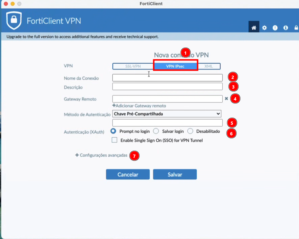 Na página que abre clique em "VPN IPsec". Será necessário configurar os campos: "Nome da Conexão", "Descrição", "Gateway Remoto", Método de Autenticação", "Autenticação (XAuth)" e "Configurações avançadas";