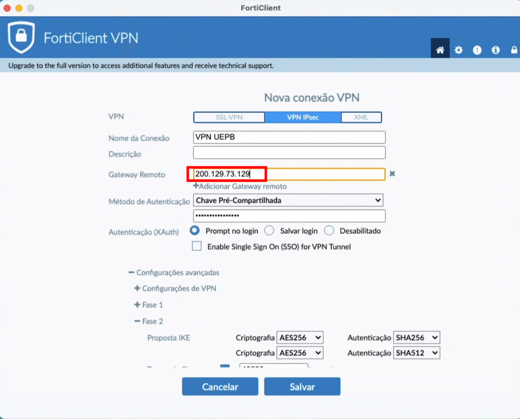 No campo "Gateway Romoto" preencha com "200.129.73.129" e no campo "Método de Autenticação" preencha com a chave "58](X-LE:N+xpisS]S";