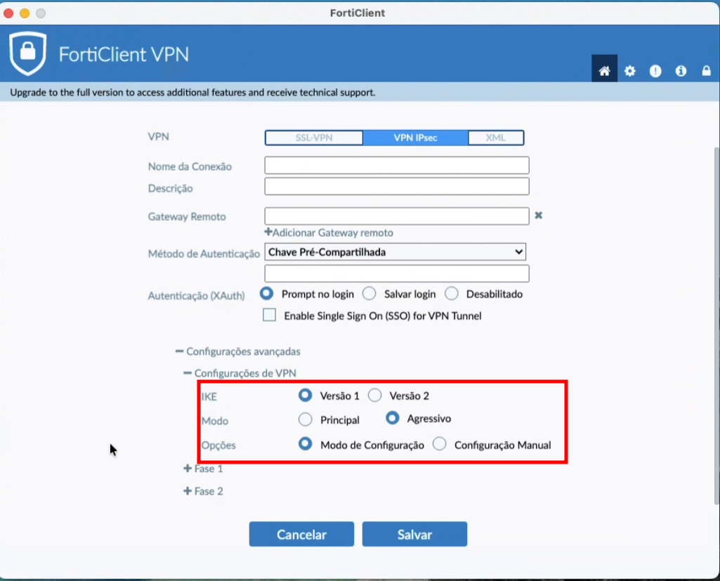Na seção "Configurações avançadas -> Configurações de VPN" selecionar as opções: IKE Versão 1, Modo Agressivo e Opções Modo de Configuração;