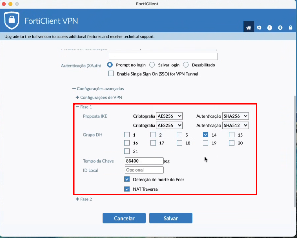 Na seção "Configurações avançadas -> Fase 1" selecionar as opções: Proposta IKE: Criptografia AES256 Autenticação SHA256, Criptografia AES256 Autenticação SHA512, Grupo DH 14, Tempo da Chave 86400, Detecção de morte do Peer e NAT Transversal;