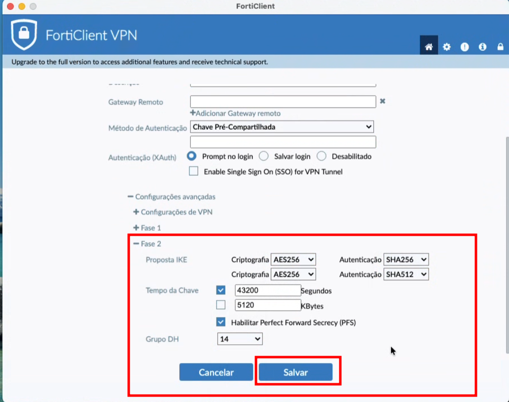 Na seção "Configurações avançadas -> Fase 2" selecionar as seguintes opções: Proposta IKE: Criptografia AES256 Autenticação SHA256 Criptografia AES256 Autenticação SHA512, Tempo da Chave 43200, Habilitar Perfect Foward Secrecy (PFS) e clicar em "Salvar".