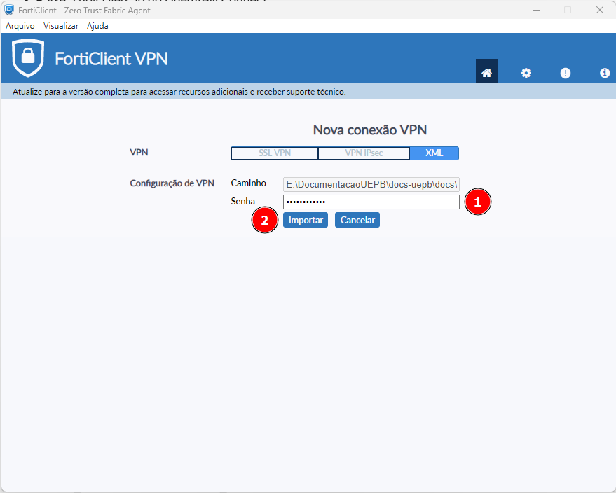 Na página que abre clique em "XML" e depois em "+ Importar Configuração XML"