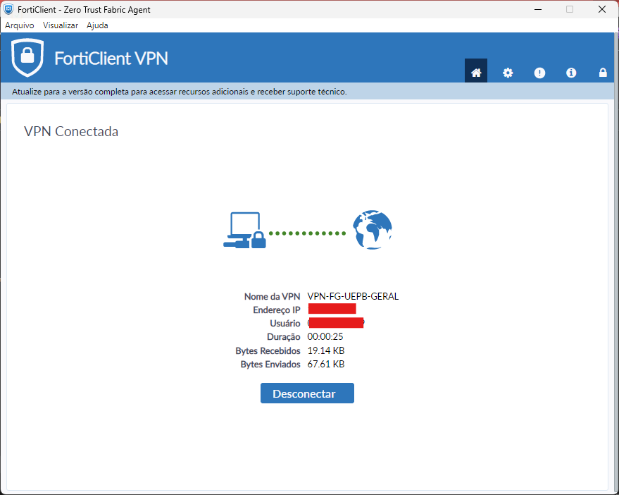 - É imprescindível DESCONECTAR da rede da UEPB clicando no botão "Desconectar", na página inicial do FortiClient VPN, para que tenha a utilização de internet particular funcionando novamente, pois além de ser mais lenta, a conexão com a UEPB está condicionada às normas de uso previstas na Instituição, bem como suas restrições e penalidades por uso impróprio.