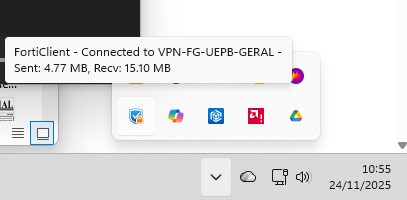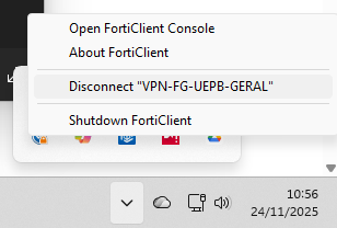 Na barra de tarefas aparece o ícone do FortiClient VPN e as opções de conexão/desconexão e configuração.