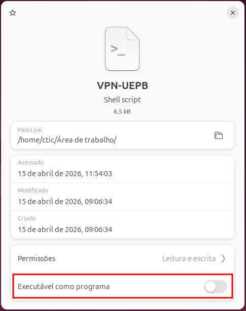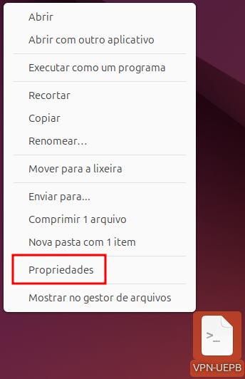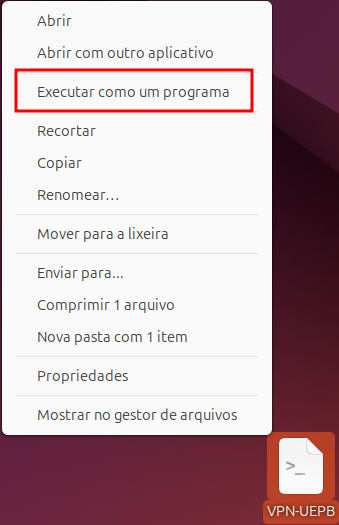 Após ativar a permissão de execução como programa, clique com o botão direito no arquivo VPN-UEPB e selecione a opção "Executar como um programa".